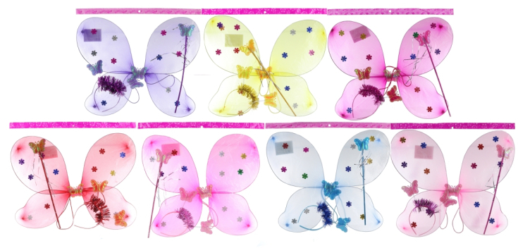 Párty křídla s kytičkami. Balení obsahuje křídla, čelenku a hůlku. Rozměr balení cca 43 x 49,5 cm. Věk 3+