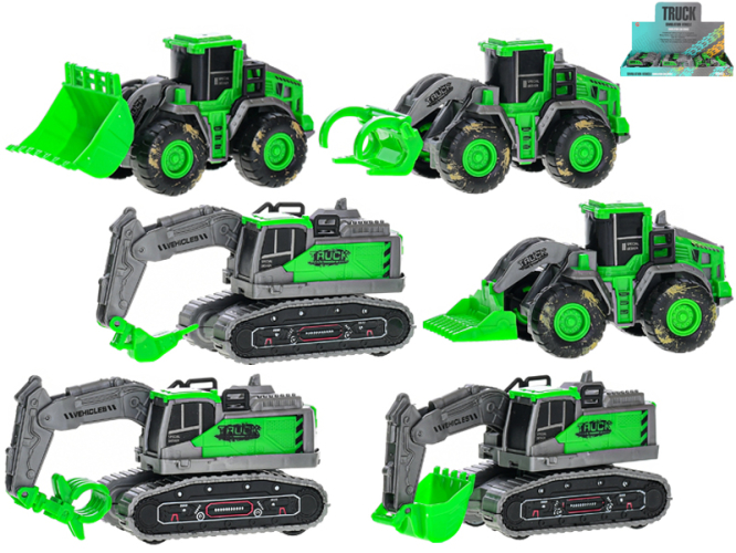 Druhy: bagr kolový větší, nakladač sena, žací stroj, drapák (kolový, pásový) Barvy: bagr (kolový, pásový), sbíječka (kolová, pásová) Rozměr: 11,5cm Věk: 3+ Materiál: plast