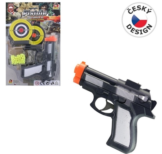 Pistole na kuličky se dvěma terči, 15 cm Hračka je určena pro děti 3+. Rozměr hračky je 15 cm. Materiál hračky je plast. Balení hračky je blister card. Karta s českým designem.