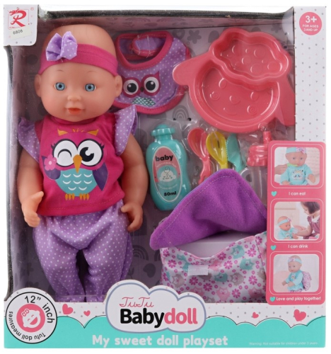 ¨Čůrací miminko - holčička. Balení obsahuje miminko o velikosti 30 cm, dudlík, lahvičku, talířek, lžičky a batůžek. Materiál plast, batůžek je látkový. Tělíčko miminka je pevné, není látkové. Rozměry balení cca 30x33x10 cm. Věk 3+