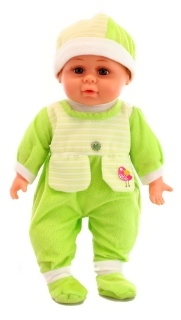 Miminko s měkkým tělíčkem. Po stlačení tělíčka začne miminko vydávat zvuky (smích, pláč, mama, tata). Miminko je oblečeno do barevného pyžámka, které lze sundat (suchý zip). Rozměry miminka cca 30 x 15 x 6 cm. Baleno v plastovém sáčku.